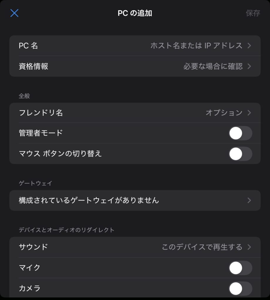 以下の画面でPC名にIPアドレスを入力。資格情報の追加を行い、ユーザー名とパスワードを追加しておきます。