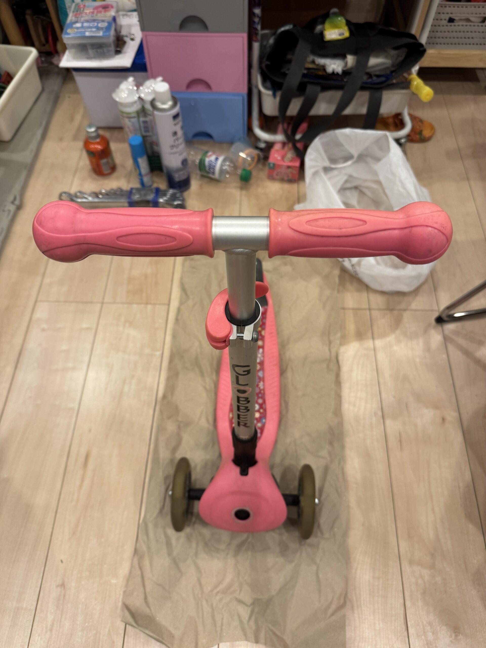 思い返せば長女が乗り、次女に引き継がれ5年ノーメンテナンスでほど乗りづづけていたので、この機に頑張ってくれているキックボードの掃除をしてみました。