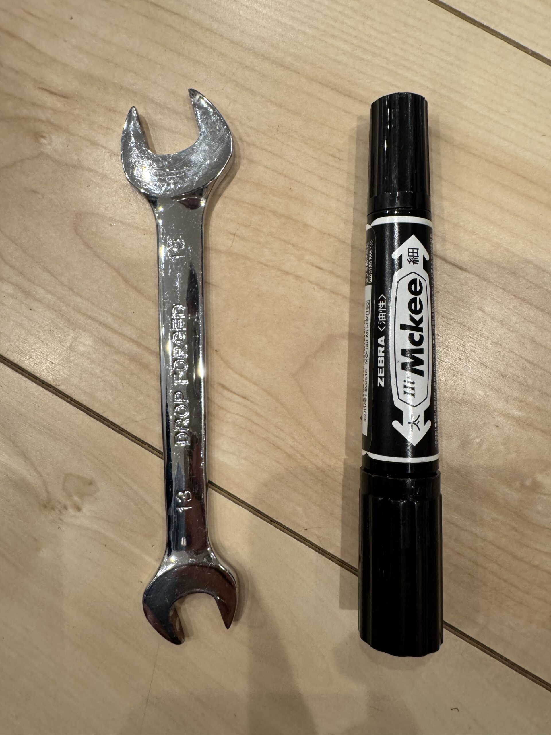 六角レンチ(No.5)とレンチ(No.10)を使ってタイヤを外していきます。